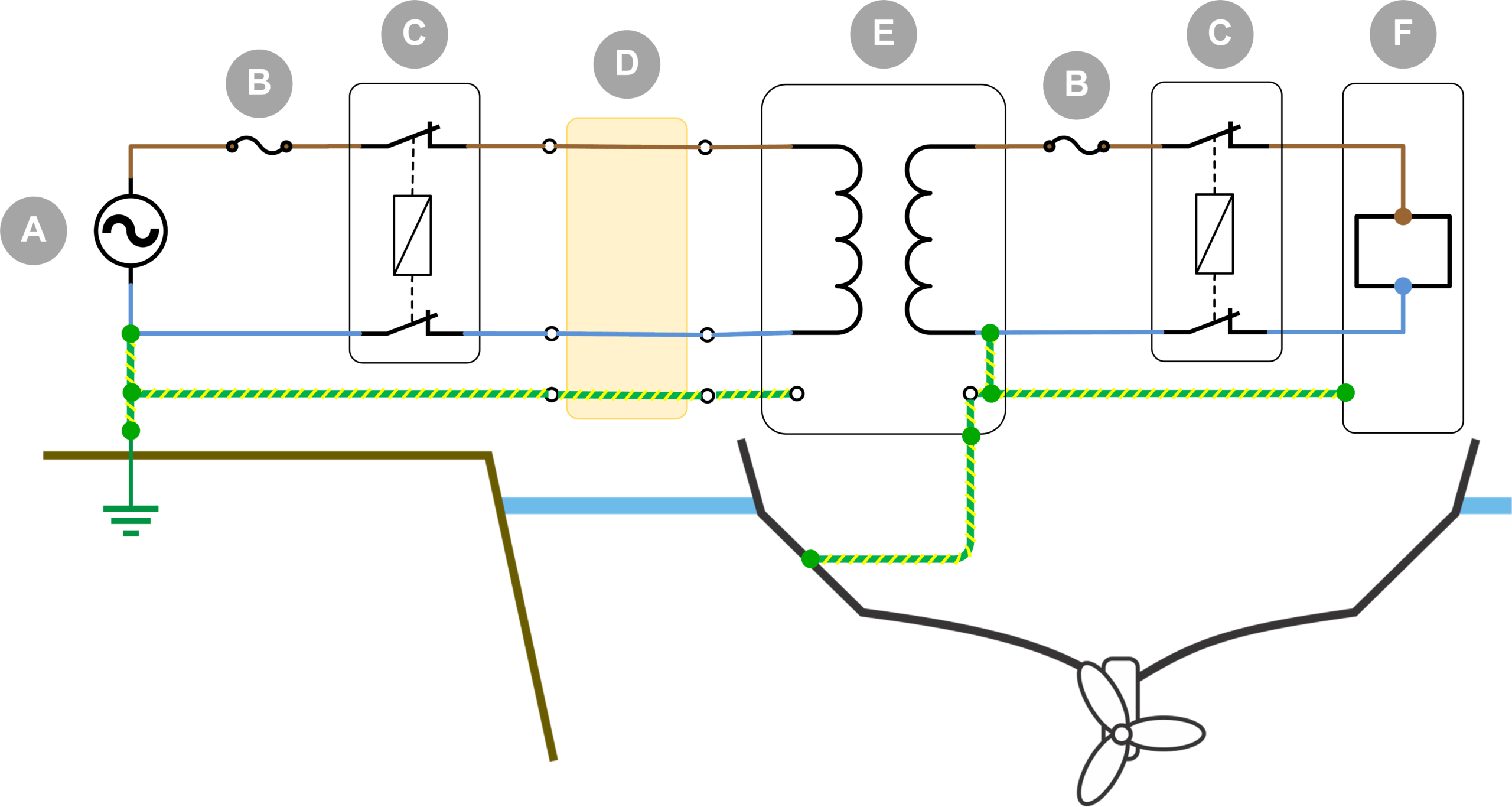 En skilletransformator ombord har det som sin primære oppgave å hindre elektrolyttisk eller galvanisk korrosjon som følge av at “båtjord” (lokal jord ombord i båten) er sammenkoblet med “landjord”. Figuren viser prinsippet: